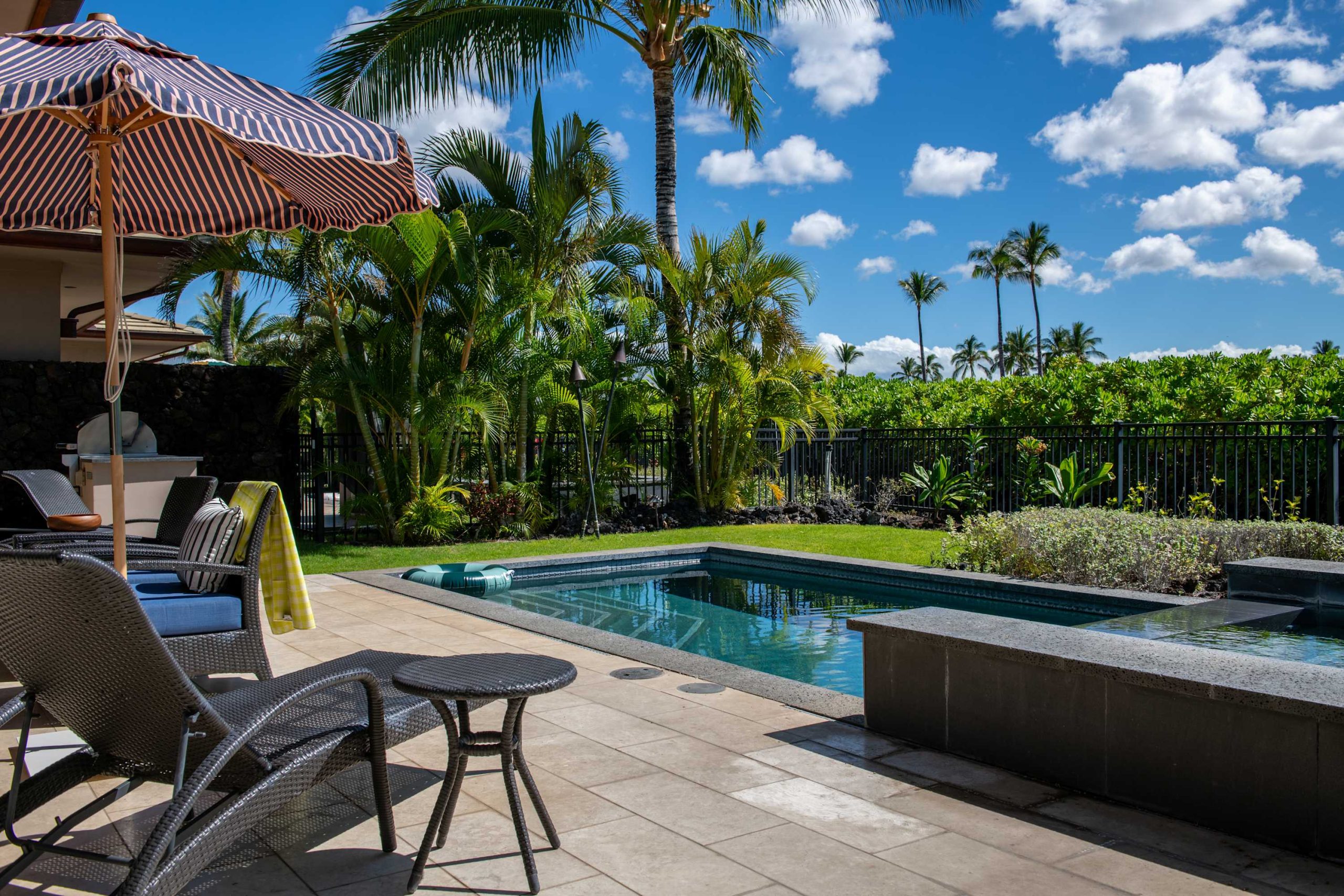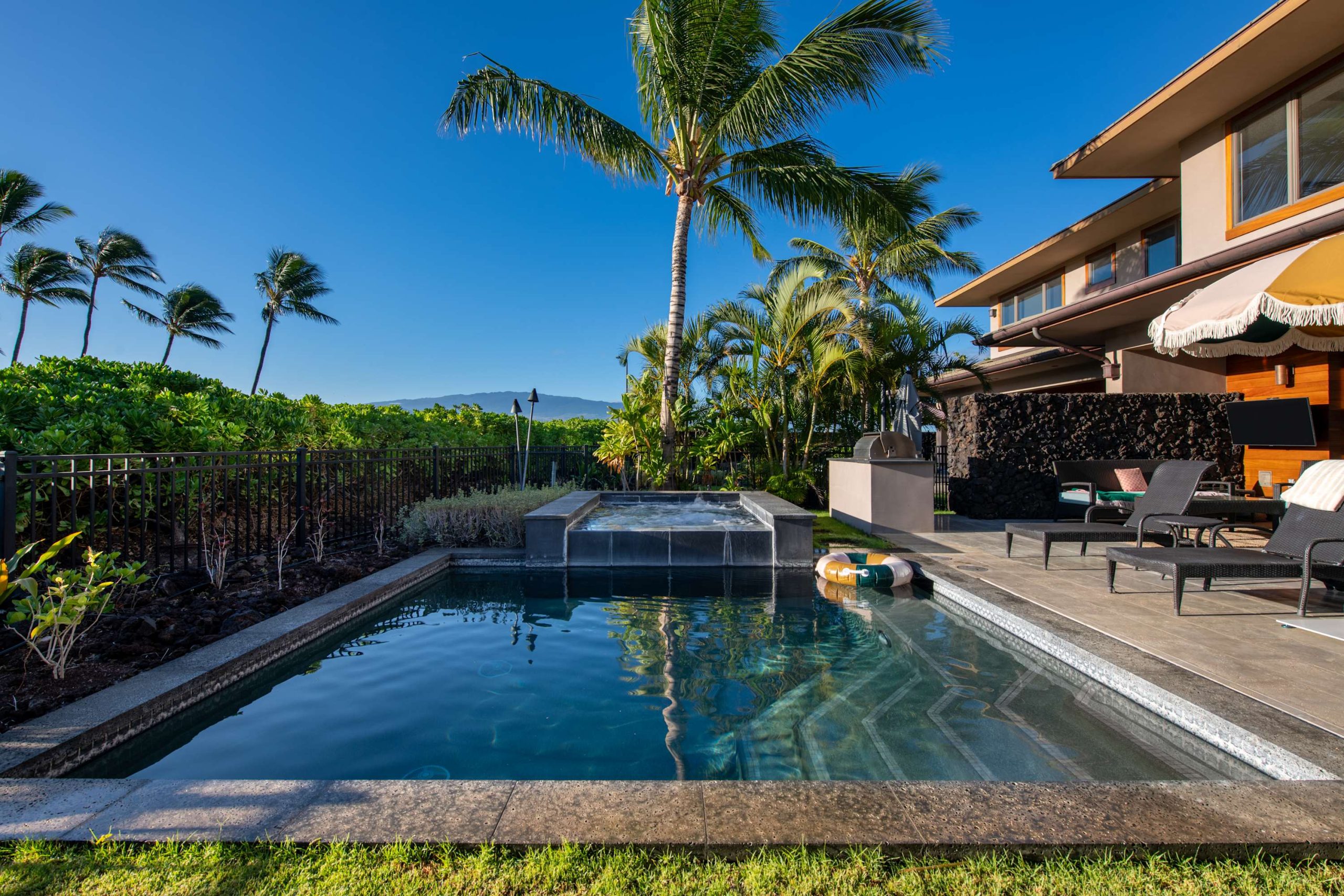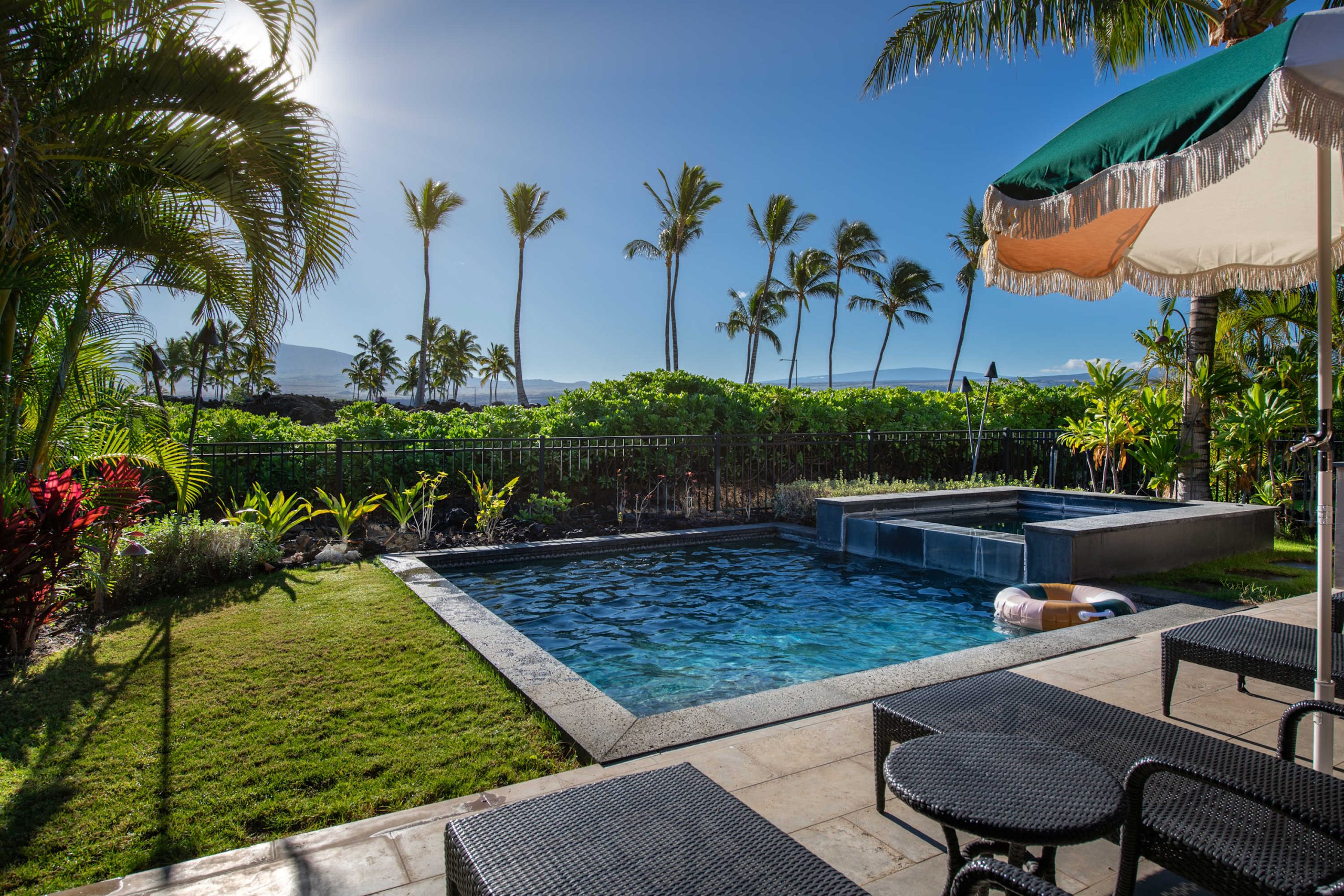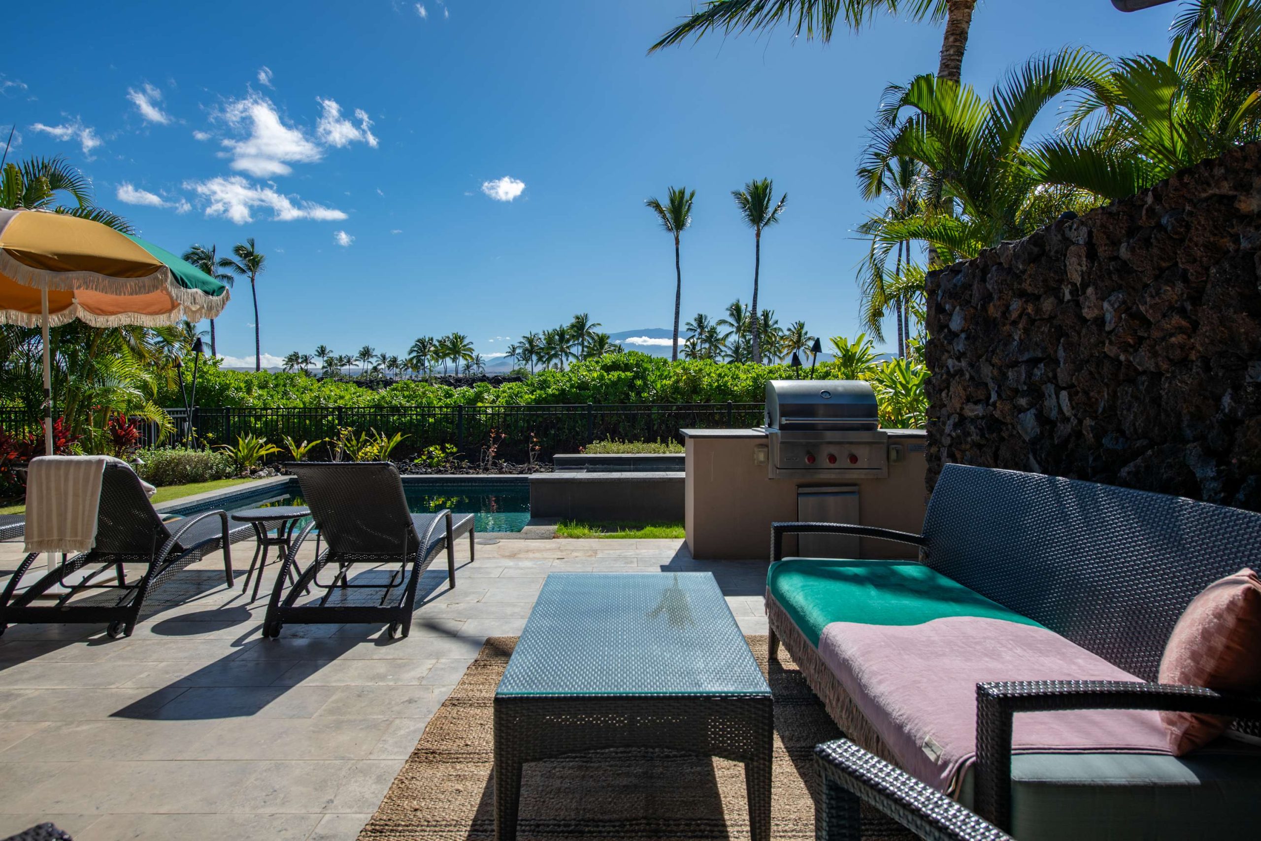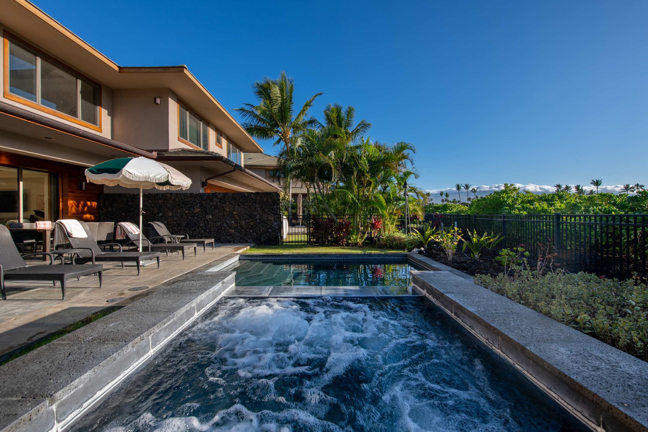 Spend your days lounging at the beach club and enjoy one of the private cabanas free of charge. While relaxing, you can have your food and beverages delivered to you as you lounge. In the evening, take some time to unwind by your private pool or watch the sunset from the second floor lanai overlooking the surrounding mountains. Golf lovers can spend a day playing golf at The Francis I’I Brown South Course right in the home’s backyard.