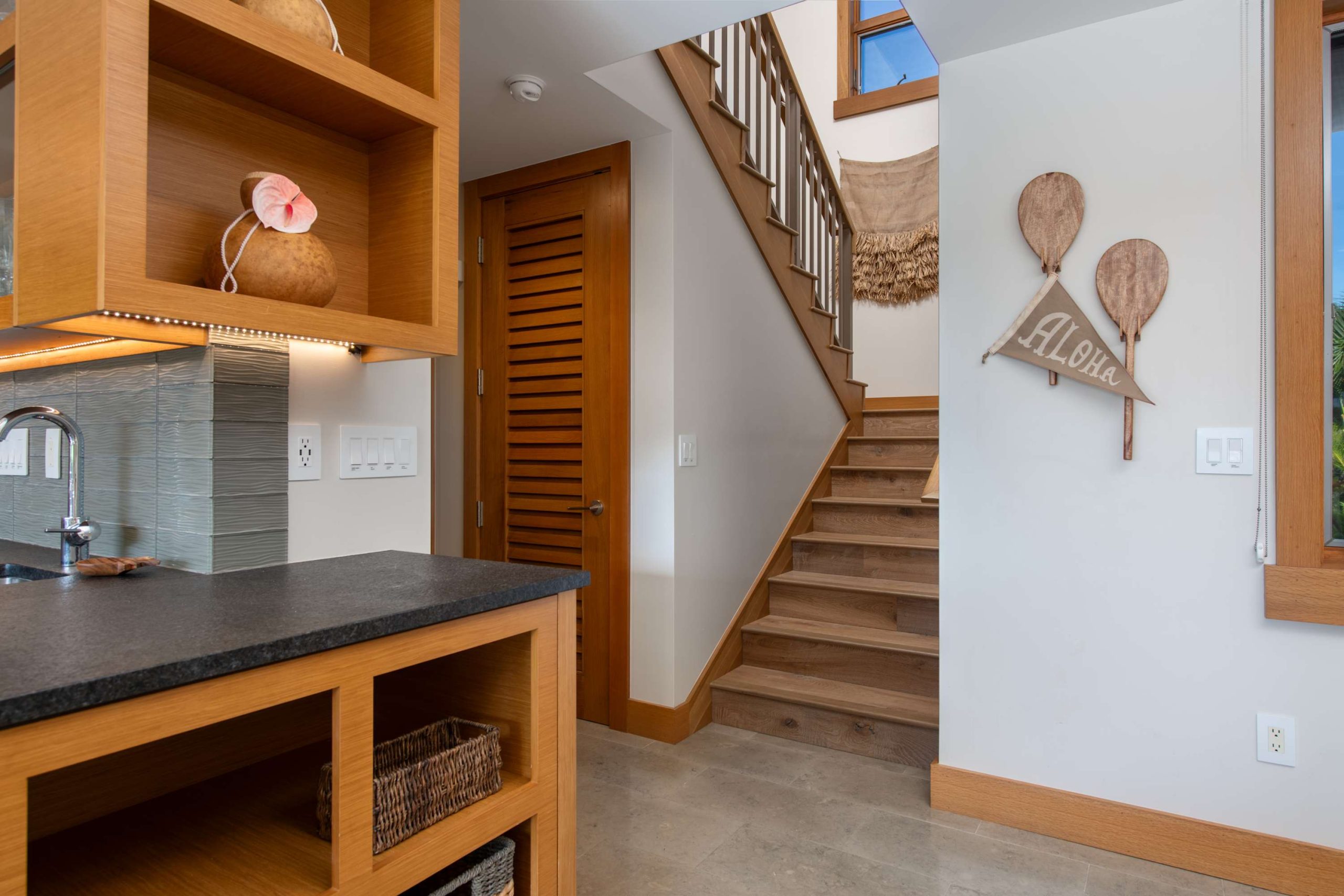 Stone flooring and hardwood finishes throughout