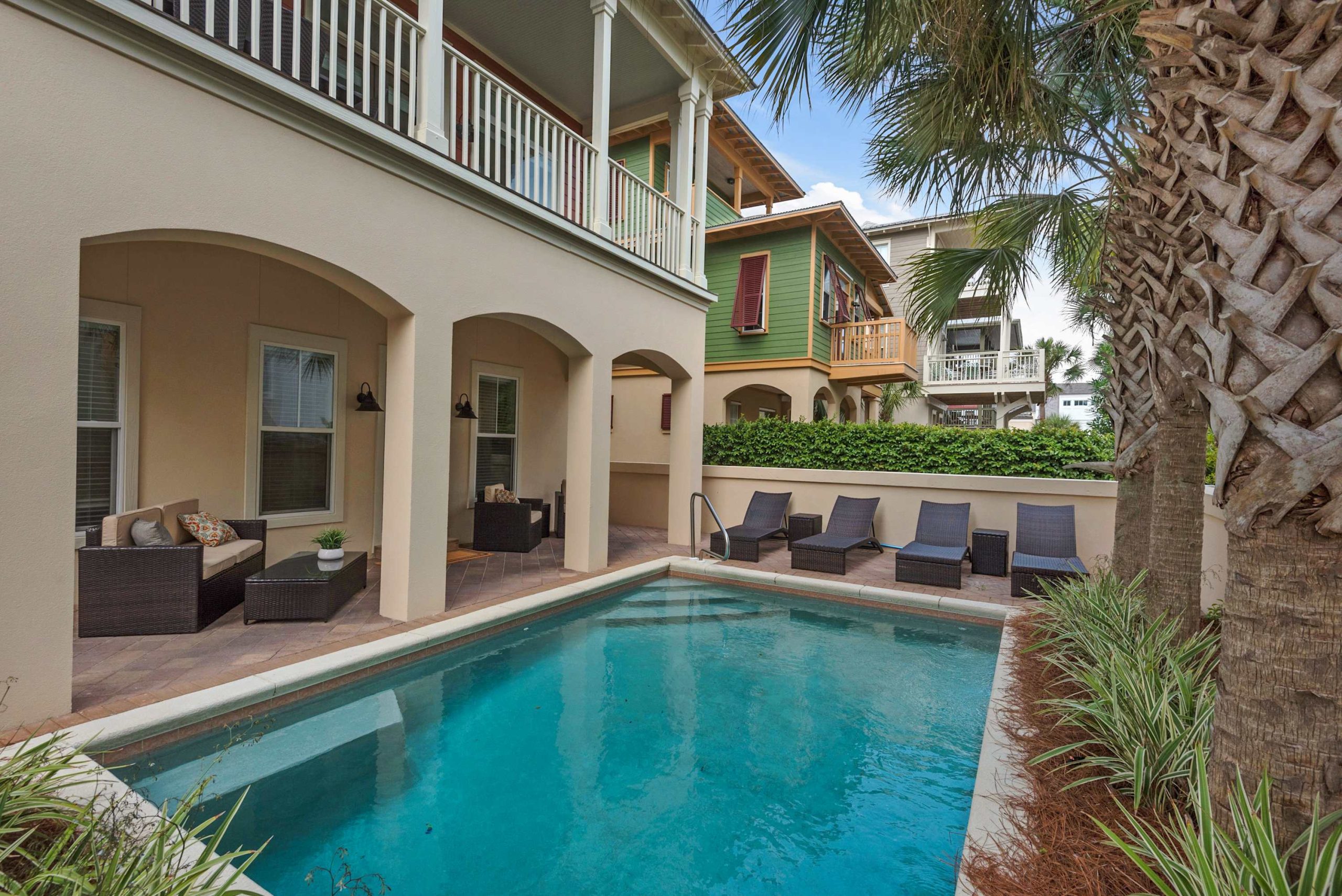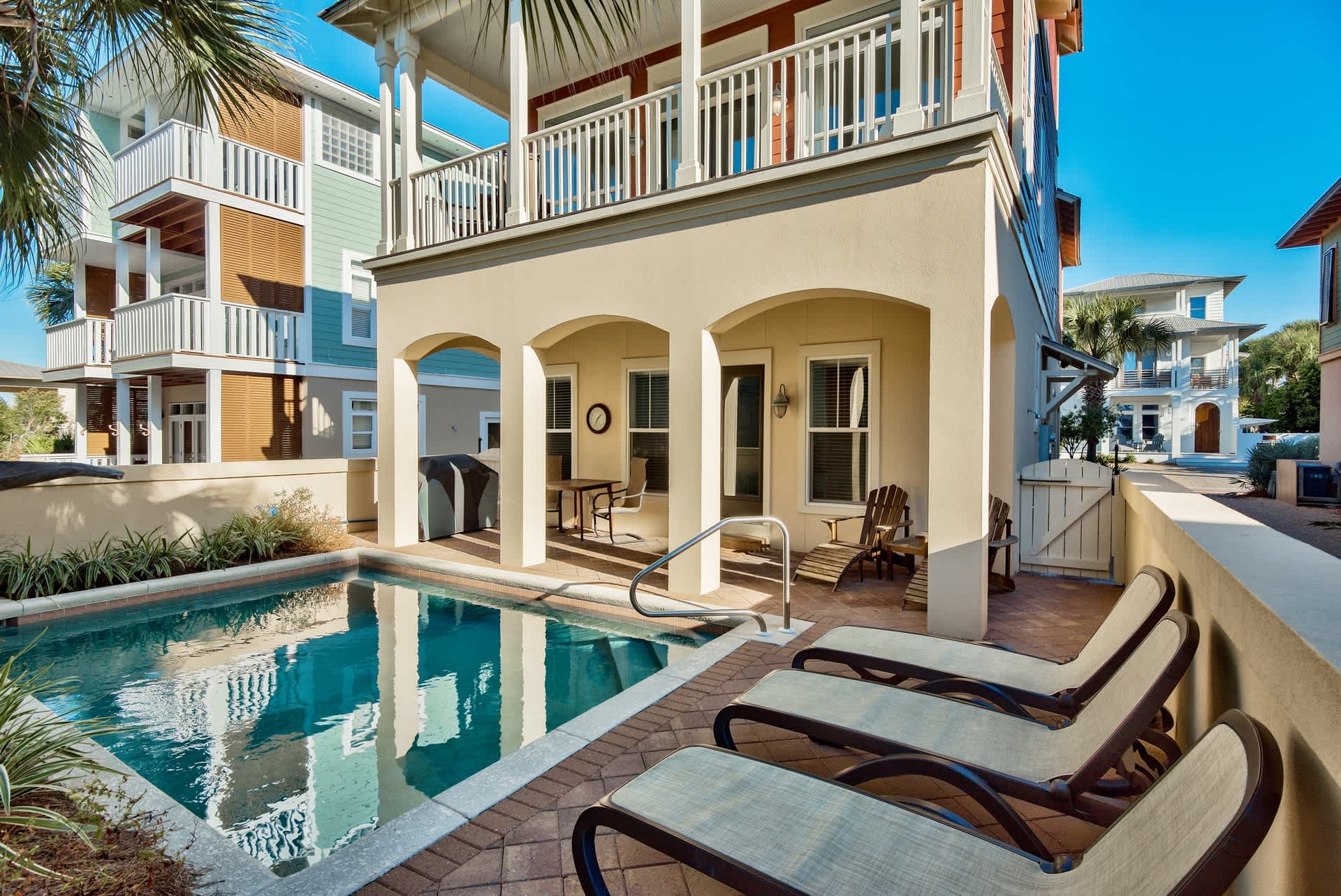 This 5 bedroom, 4 bath home can comfortably accommodate up to 12 people. Each rental includes a complimentary beach chair and umbrella setup to make your day on the sand as relaxing as possible. Bicycles are available for scenic rides down highway 30A to the town’s many shops and restaurants. The home features a private, heated pool, a fully equipped kitchen, a BBQ, balconies and decks on each floor, a spacious living area, full bath amenities, and everything you need to enjoy a wonderful stay.