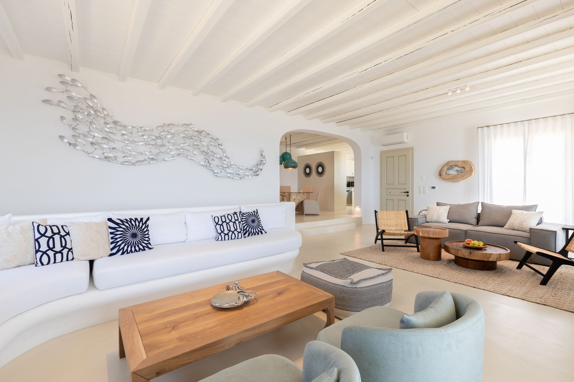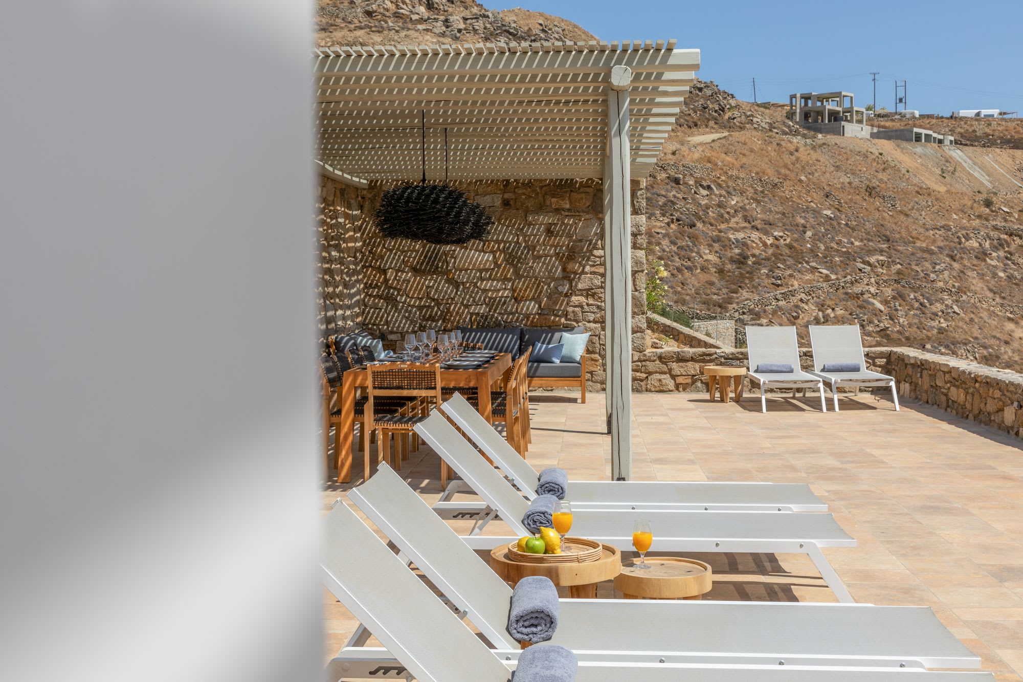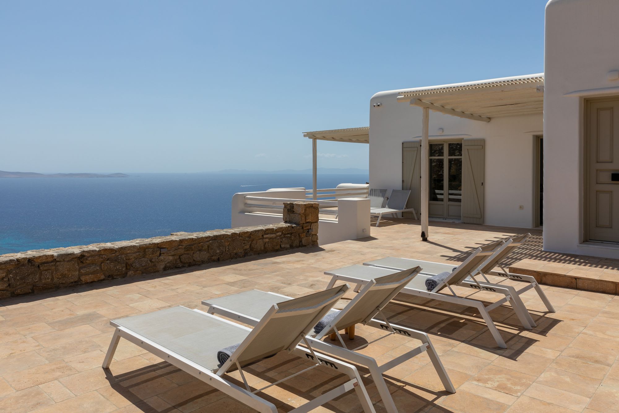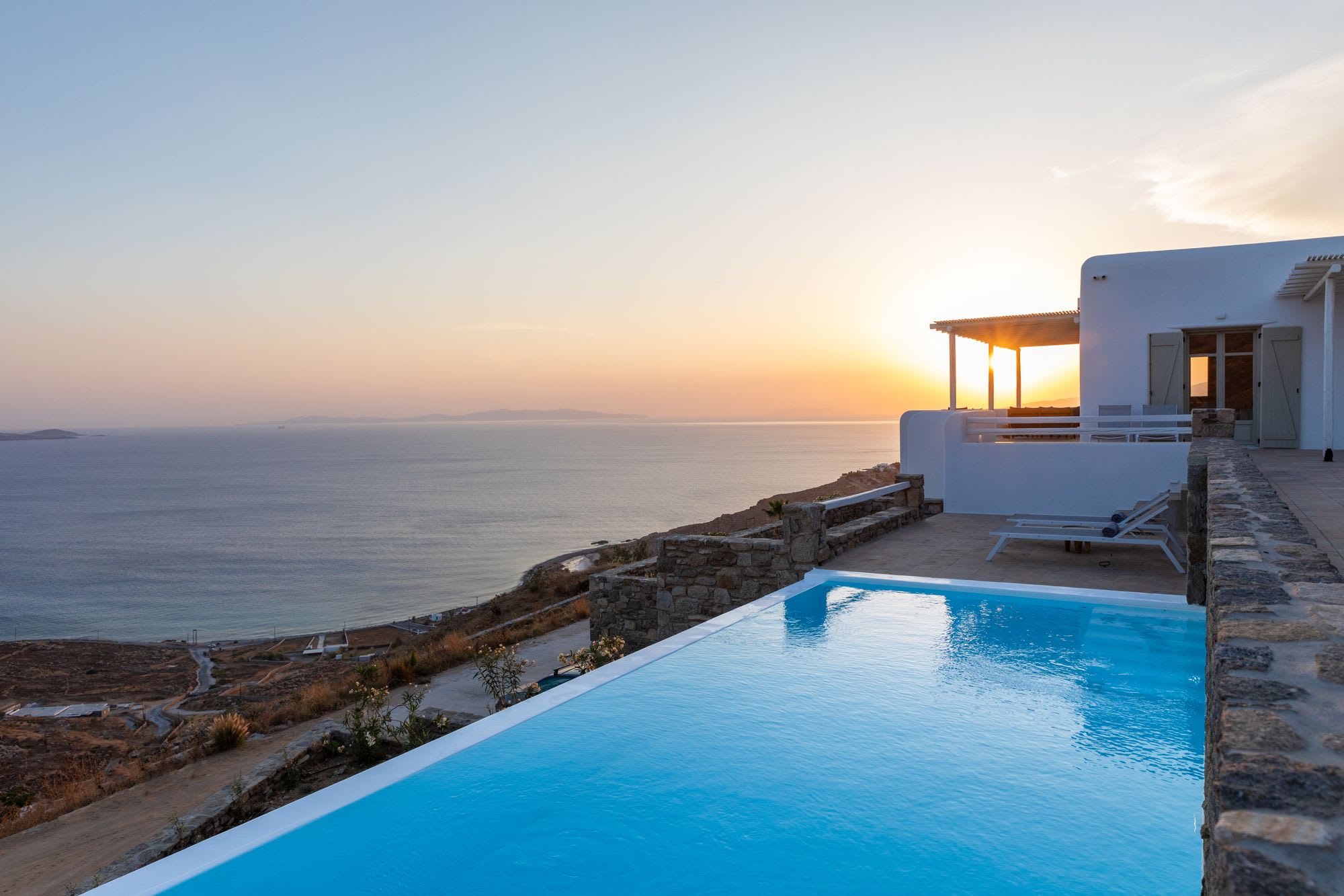 Mykonos is blessed with idyllic beaches of turquoise waters that meet fine powder sand. Our luxury villa features breathtaking sunset views overlooking the crystal blue Aegean Sea and the neighboring islands of Tinos and Delos. Ideal for those who wish for privacy, peace and quiet, our 5-bedroom, 4.5-bathroom Mykonos villa offers luxury living space, an outdoor pool, large verandas with pergolas, modern amenities and much more.