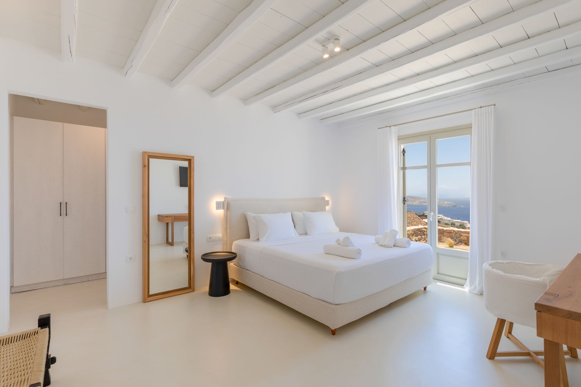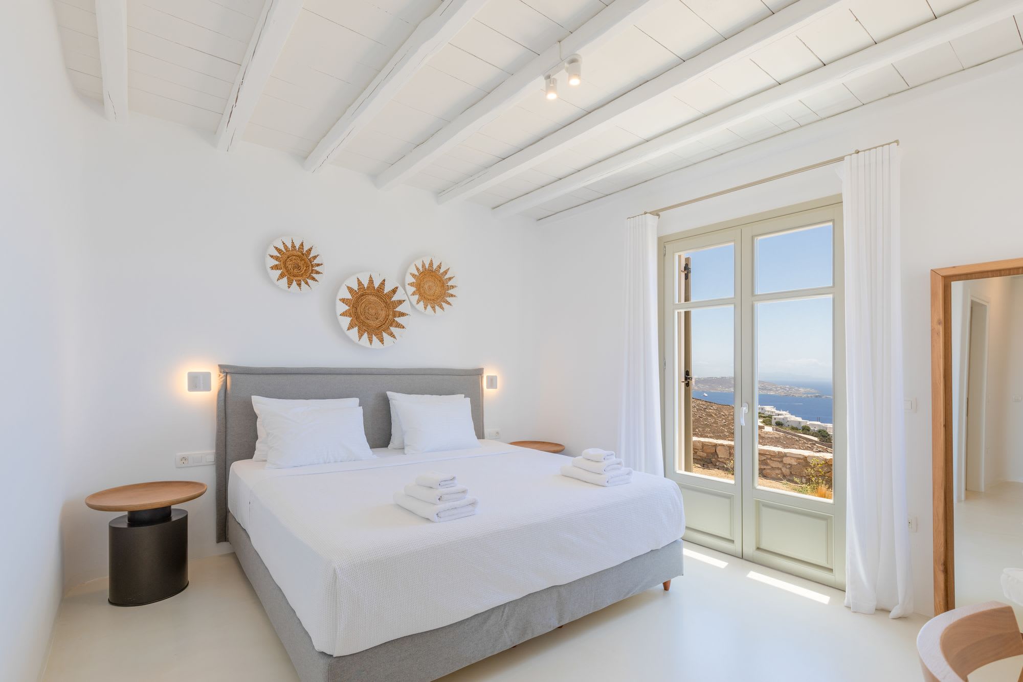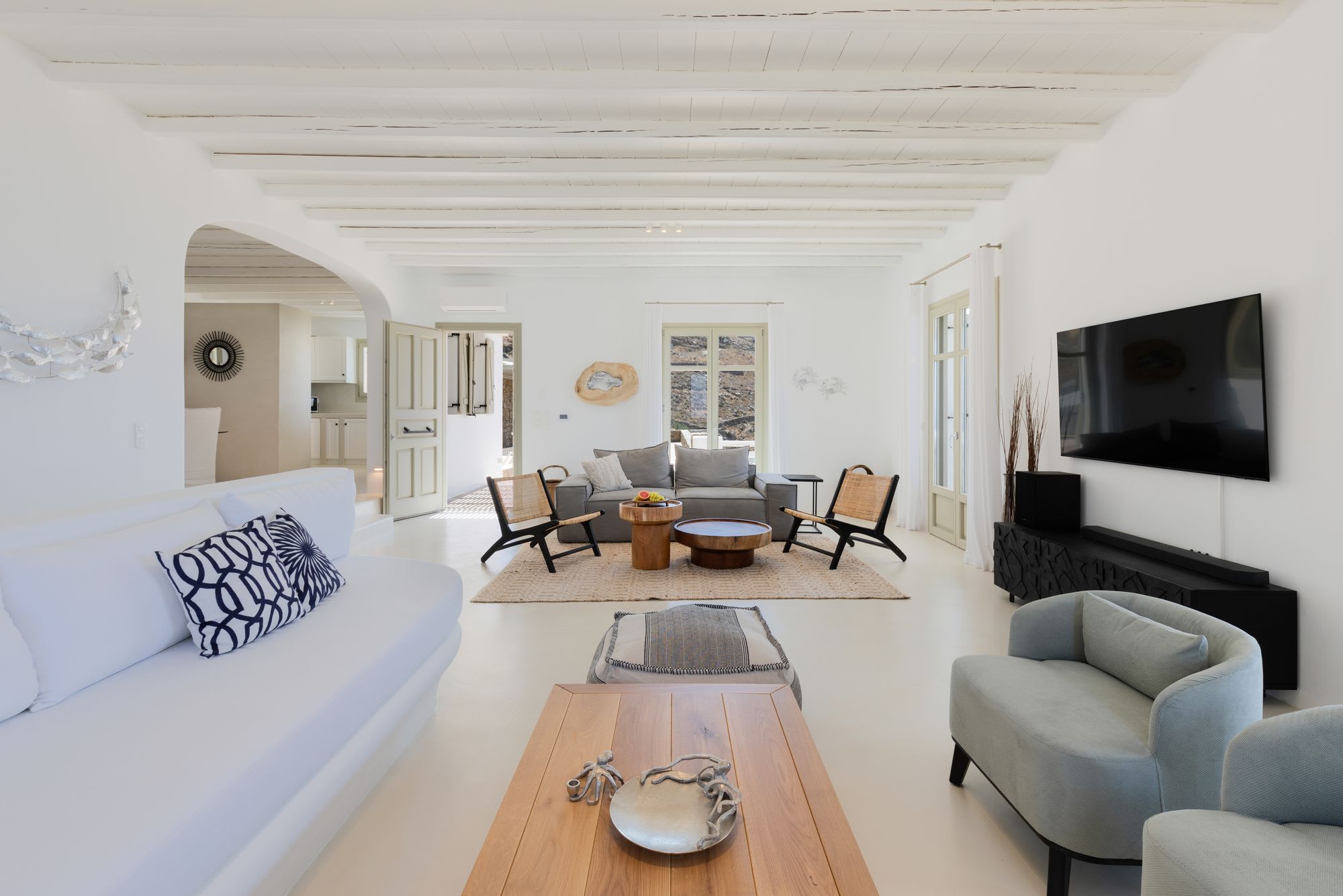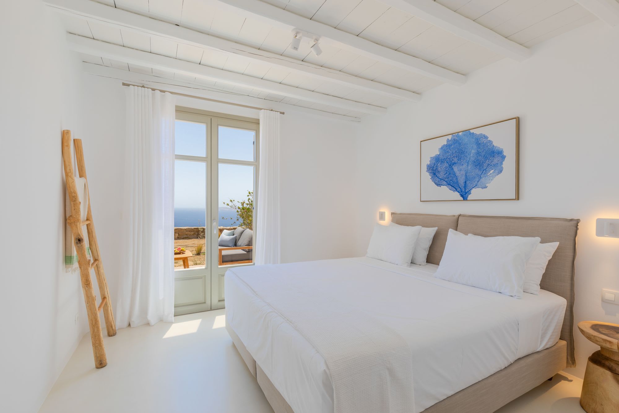 Mykonos is blessed with idyllic beaches of turquoise waters that meet fine powder sand. Our luxury villa features breathtaking sunset views overlooking the crystal blue Aegean Sea and the neighboring islands of Tinos and Delos. Ideal for those who wish for privacy, peace and quiet, our 5-bedroom, 4.5-bathroom Mykonos villa offers luxury living space, an outdoor pool, large verandas with pergolas, modern amenities and much more.