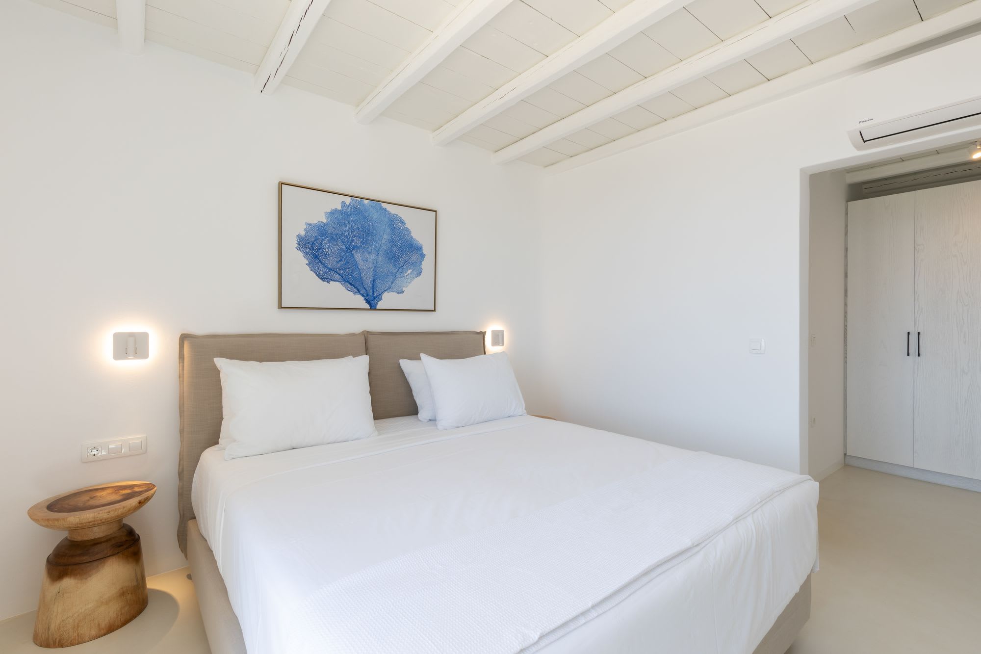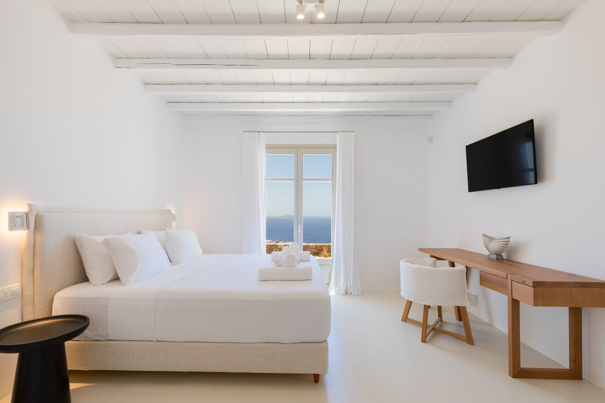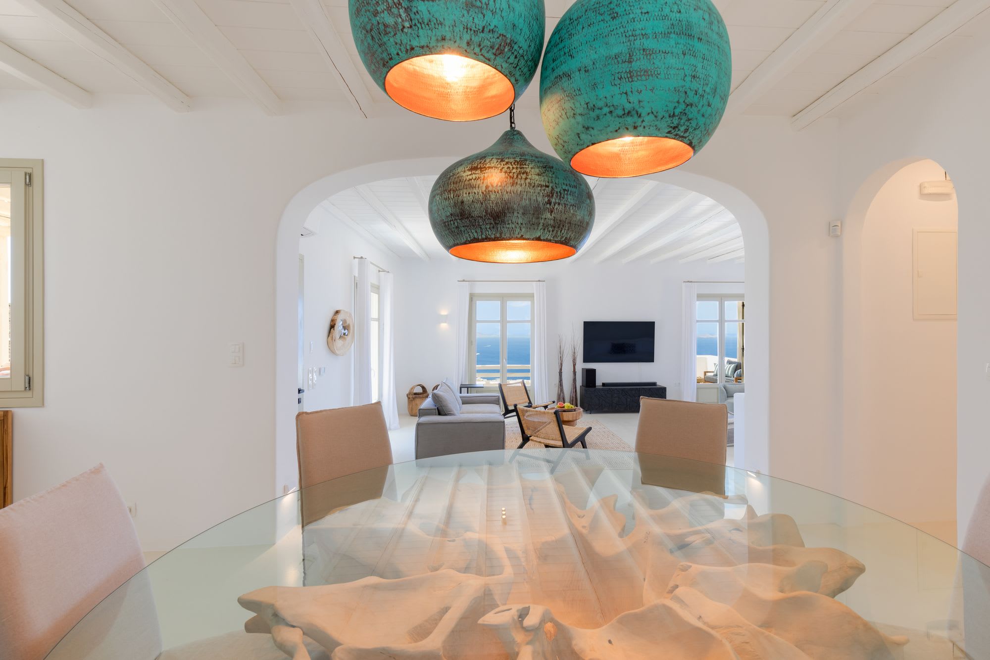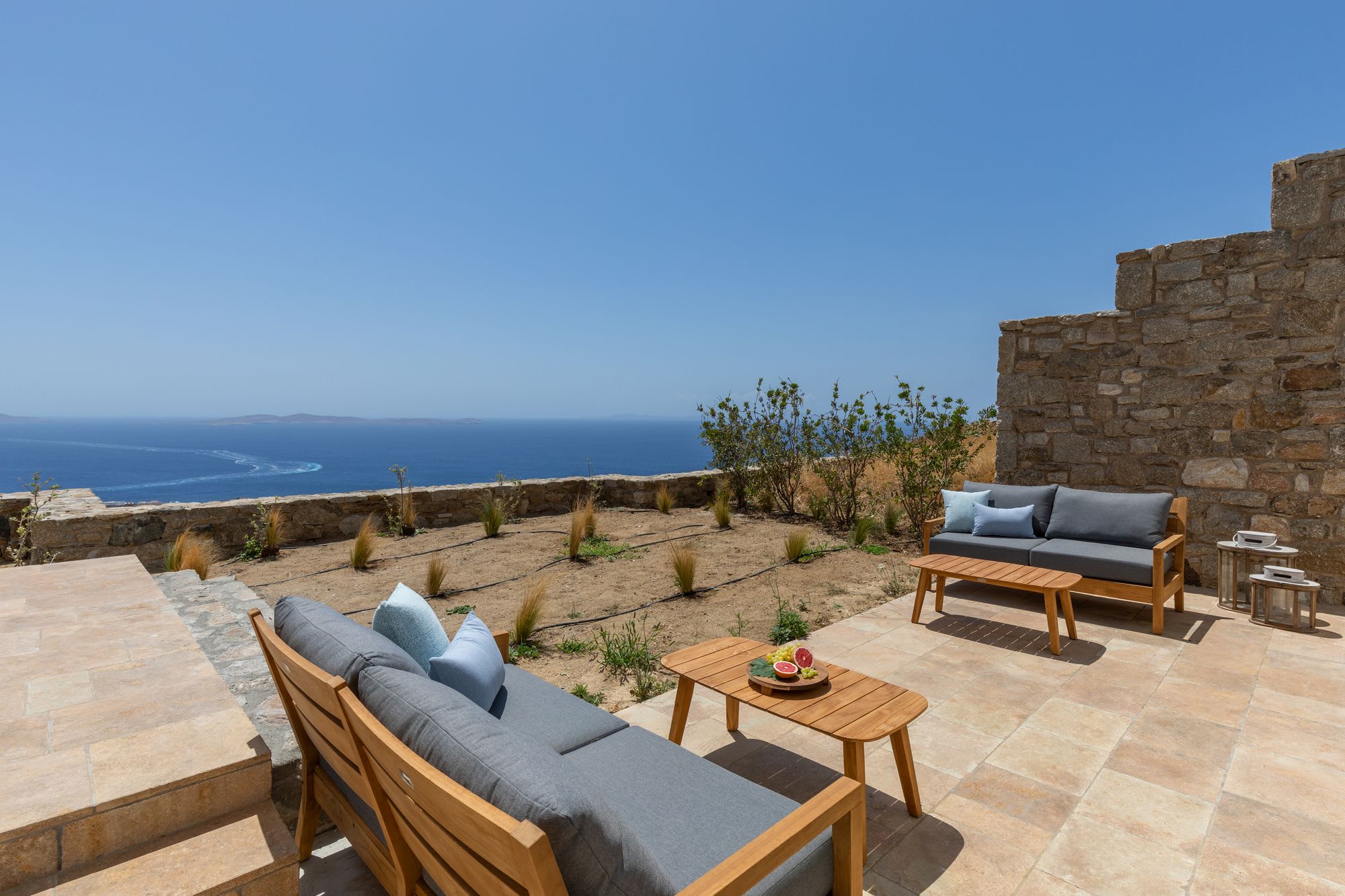 Mykonos is blessed with idyllic beaches of turquoise waters that meet fine powder sand. Our luxury villa features breathtaking sunset views overlooking the crystal blue Aegean Sea and the neighboring islands of Tinos and Delos. Ideal for those who wish for privacy, peace and quiet, our 5-bedroom, 4.5-bathroom Mykonos villa offers luxury living space, an outdoor pool, large verandas with pergolas, modern amenities and much more.