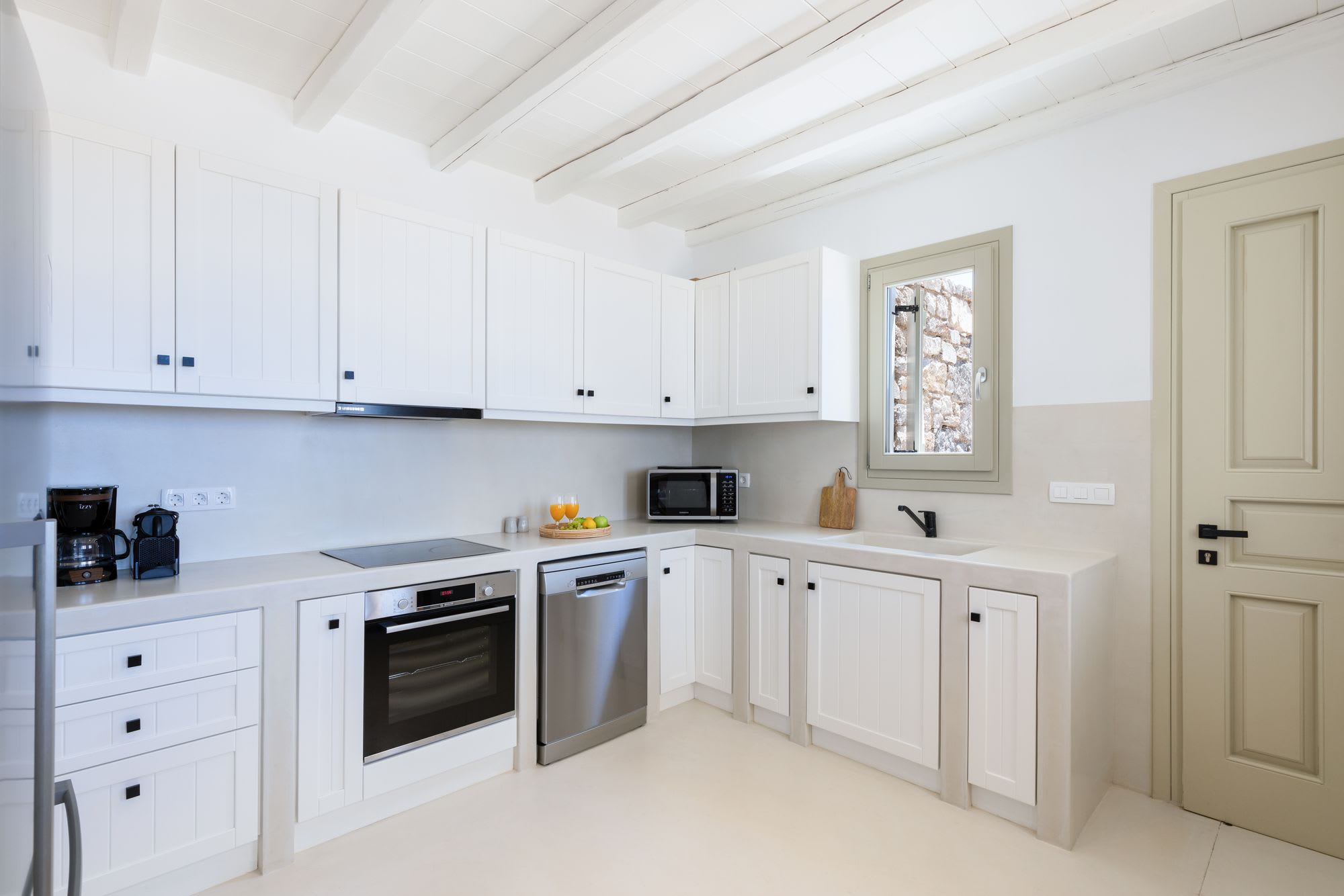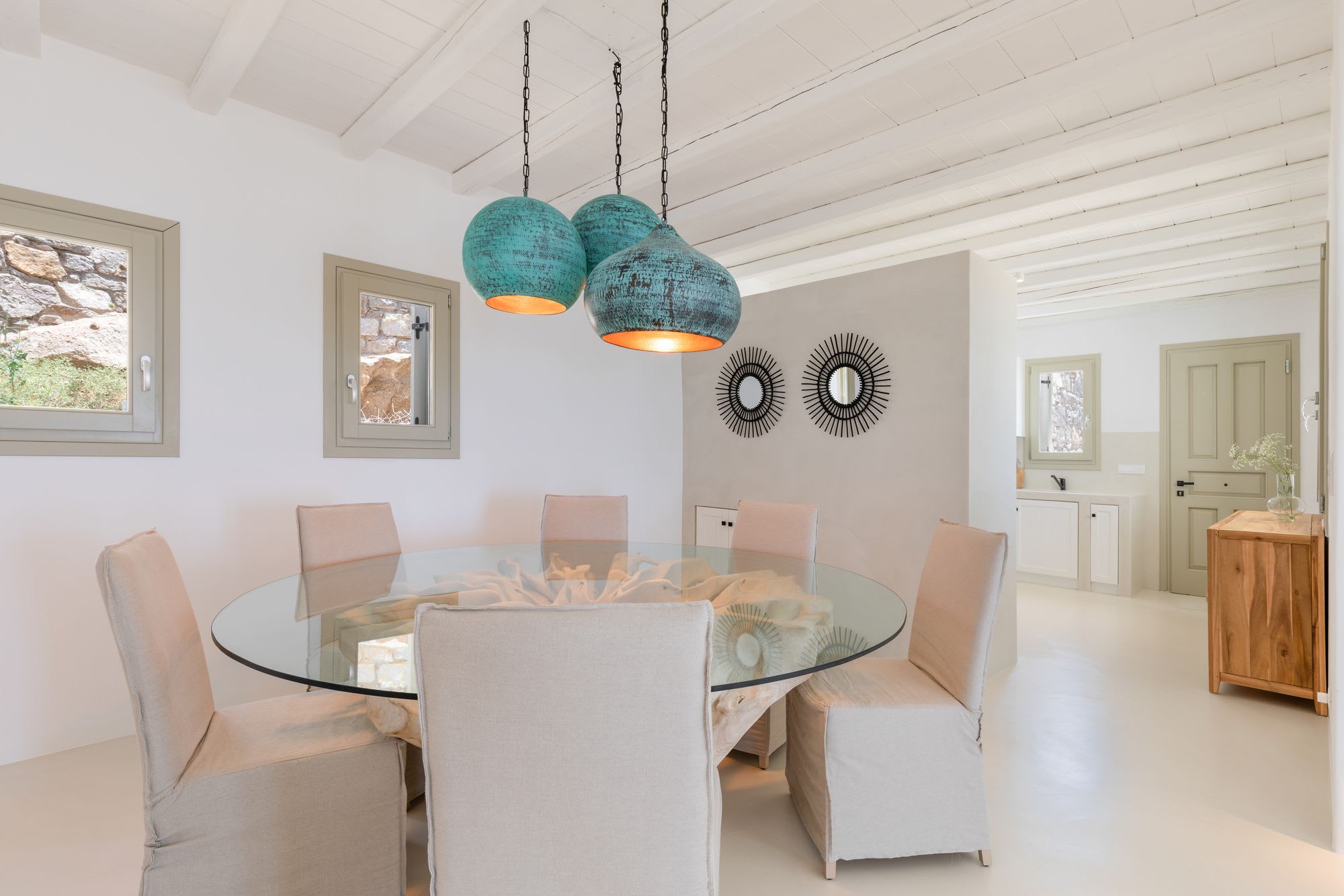 Our villa is located only four kilometers from the Town of Mykonos. Known as Chora by the locals, it is one of the best-preserved historic towns in Greece. A traditional Cycladic village with white-washed cubical houses featuring bright-colored wooden doors and windows, blue-domed churches, purple bougainvillea-covered archways, and narrow cobblestone streets forming a labyrinth. Eating is one of the top things to do in all of Greece and many of the best restaurants are here.